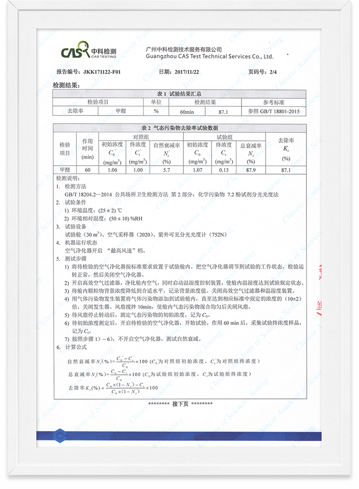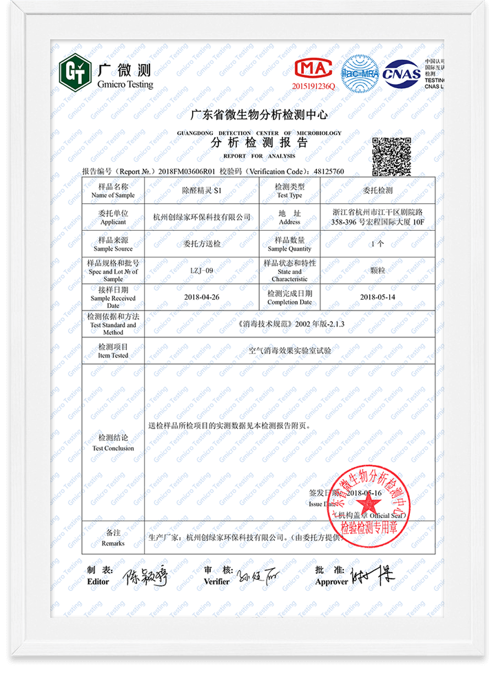 除醛精靈甲醛去除率檢測報告