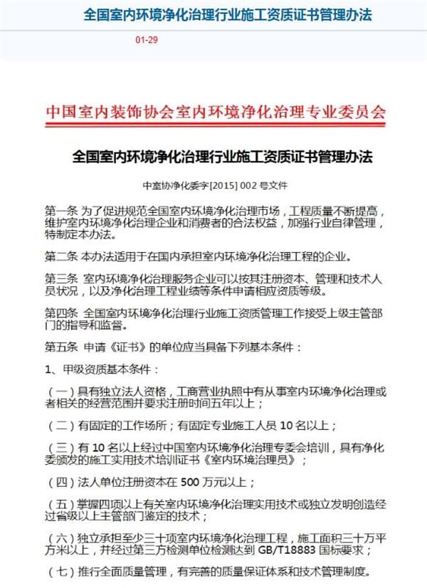 中國室內(nèi)裝飾協(xié)會(huì)室內(nèi)環(huán)境凈化治理專業(yè)委員會(huì)資質(zhì)管理:http://www.cicen.org/erji.php?id=92&bid=182