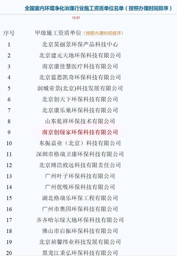 恭喜南京創(chuàng)綠家環(huán)??萍加邢薰精@得全國室內(nèi)環(huán)境凈化治理行業(yè)甲級施工資質(zhì)證書?。?!目前全國室內(nèi)環(huán)境凈化治理行業(yè)具有甲級施工資質(zhì)的企業(yè)僅有20家,創(chuàng)綠家是第九位獲得全國甲級施工資質(zhì)的公司! 此外,創(chuàng)綠家環(huán)??萍加邢薰具€是中國室內(nèi)裝飾協(xié)會(huì)室內(nèi)環(huán)境凈化治理委員會(huì)會(huì)員單位、中國建筑室內(nèi)生態(tài)環(huán)境綜合研究課題承擔(dān)企業(yè)、全國室內(nèi)車內(nèi)環(huán)境凈化治理先進(jìn)單位!