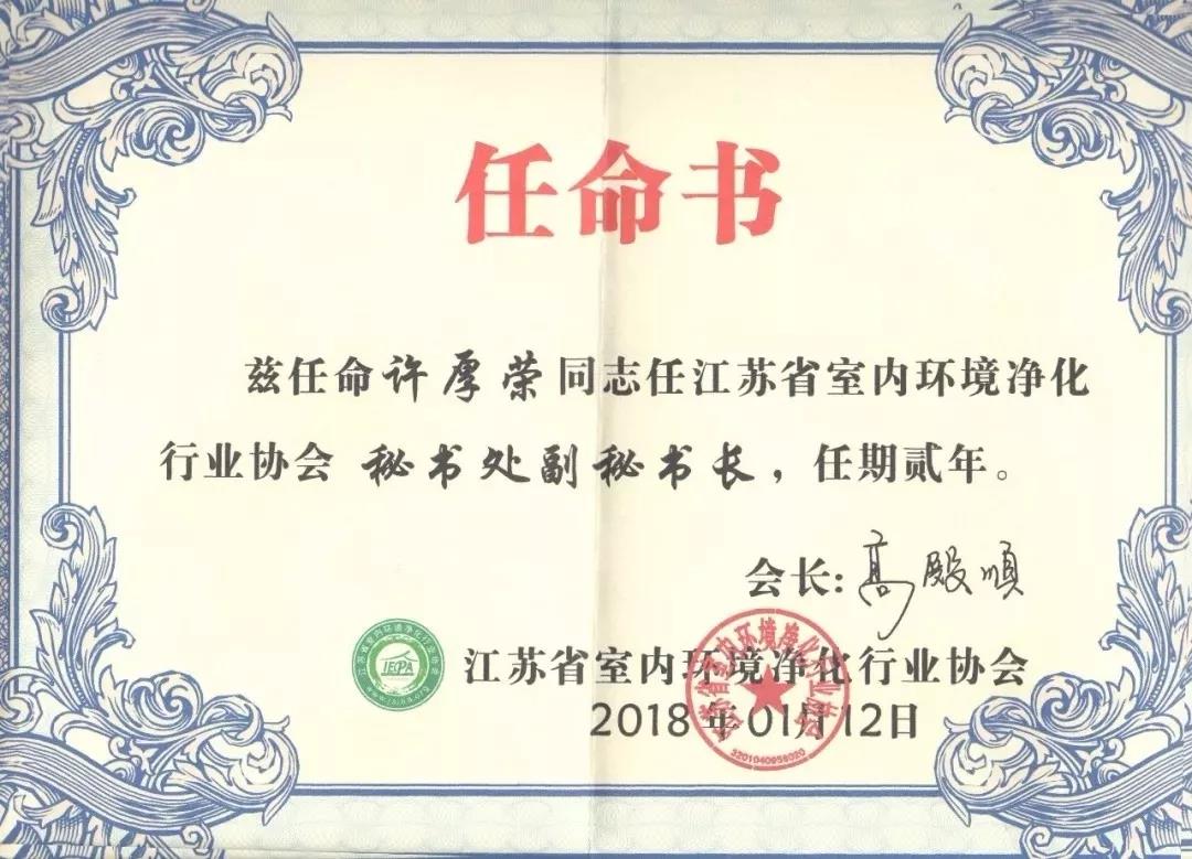 2018年1月13日,“中國(guó)室內(nèi)環(huán)境凈化行業(yè)協(xié)會(huì)聯(lián)盟”與“江蘇省室內(nèi)環(huán)境凈化行業(yè)協(xié)會(huì)”聯(lián)合舉辦的首屆“中國(guó)室內(nèi)環(huán)保行業(yè)創(chuàng)新創(chuàng)優(yōu)、融合發(fā)展”高峰技術(shù)年會(huì)在中國(guó)南京召開(kāi)。協(xié)會(huì)隆重表彰了2017年度行業(yè)“突出貢獻(xiàn)獎(jiǎng)”——許厚榮,任命其為江蘇省室內(nèi)環(huán)境凈化行業(yè)協(xié)會(huì)秘書(shū)處副秘書(shū)長(zhǎng)。