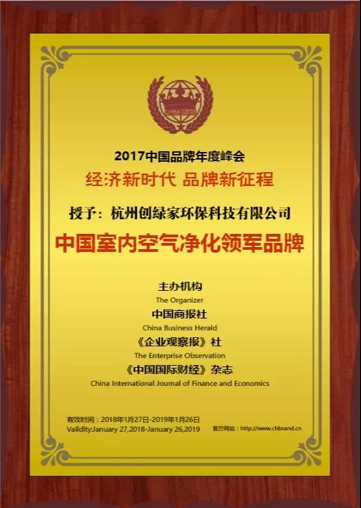 2018年1月26日-28日,由中國(guó)商報(bào)社、《企業(yè)觀察報(bào)》社和《中國(guó)國(guó)際財(cái)經(jīng)》雜志聯(lián)合主辦的“2017中國(guó)品牌年度峰會(huì)”在京隆重舉行。杭州創(chuàng)綠家環(huán)保科技有限公司榮獲“中國(guó)室內(nèi)空氣凈化領(lǐng)軍品牌”殊榮。