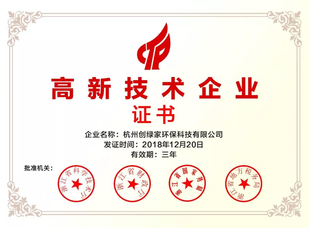2018年12月,杭州創(chuàng)綠家環(huán)??萍加邢薰颈徽J(rèn)定為國(guó)家高新技術(shù)企業(yè)。
