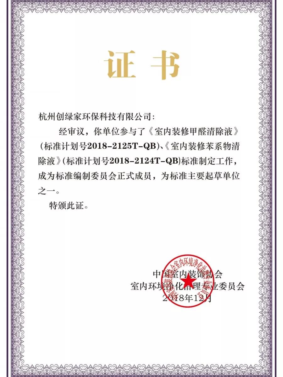 2018年12月19日,中國(guó)室內(nèi)環(huán)境凈化治理行業(yè)第五屆技術(shù)創(chuàng)新分享會(huì)在北京新聞大廈長(zhǎng)安發(fā)布廳舉行。創(chuàng)綠家環(huán)保成為《室內(nèi)裝修甲醛清除液》、《室內(nèi)裝修苯系物清除液》標(biāo)準(zhǔn)內(nèi)編制委員會(huì)正式成員,為標(biāo)準(zhǔn)主要起草單位之一,創(chuàng)綠家環(huán)??偛脤O劍被聘任為該標(biāo)準(zhǔn)編委會(huì)委員。