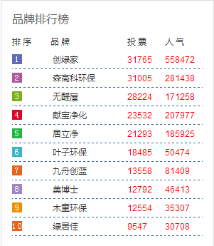 在中國除醛網(wǎng)舉辦的2016年度室內(nèi)除甲醛產(chǎn)品十大品牌評選中,經(jīng)過三個(gè)月的激烈角逐,創(chuàng)綠家一路披荊斬棘進(jìn)入十強(qiáng),并榮獲年度十大品牌之首!