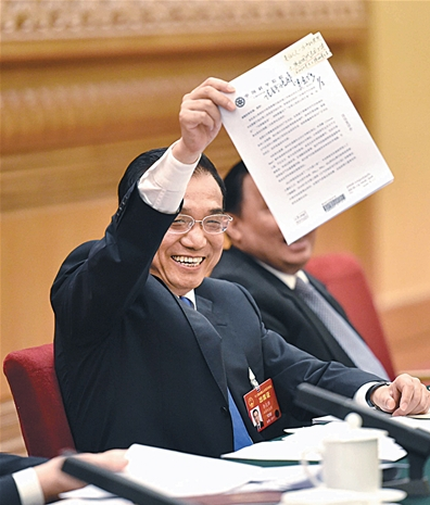 9日,在陜西代表團審議現(xiàn)場,李克強舉著信說“信在這兒,我已經(jīng)批示了”。