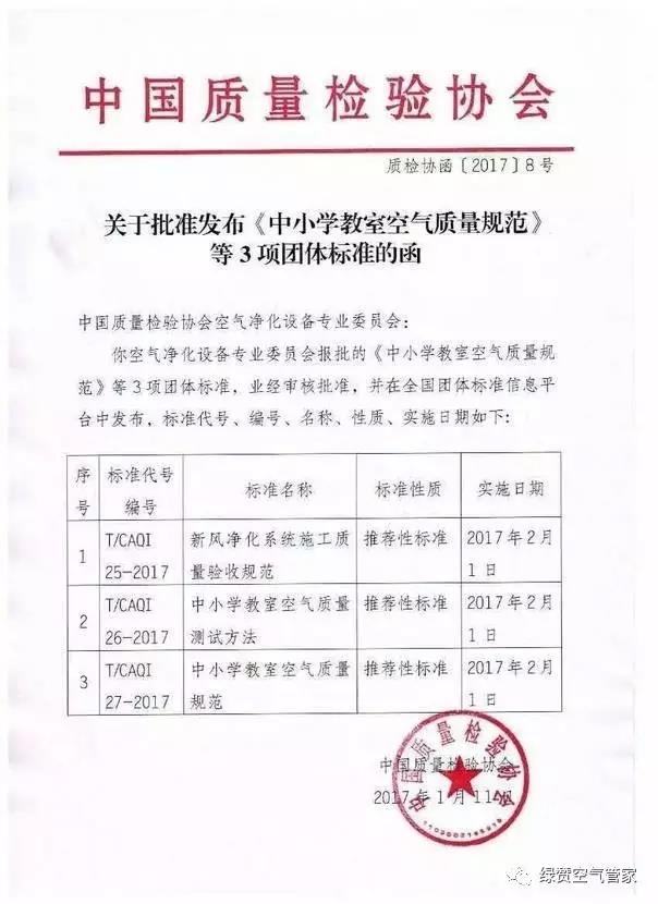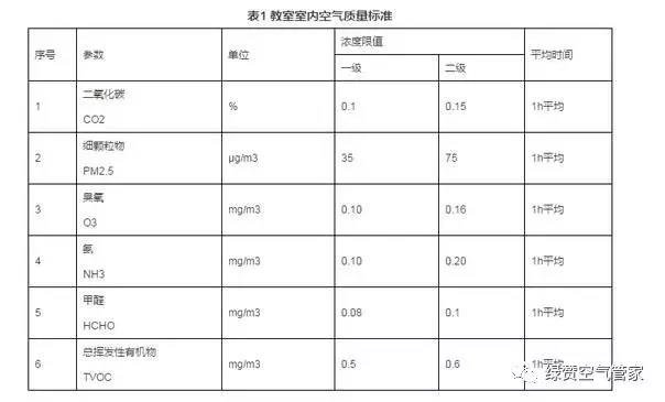 T/CAQI 27-2017《中小學教室空氣質(zhì)量規(guī)范》是一項綜合性標準,在GB/T 18883-2002的基礎上對關(guān)鍵室內(nèi)空氣質(zhì)量參數(shù)進行規(guī)定。標準的主要內(nèi)容是:范圍;規(guī)范性引用文件;教室內(nèi)空氣質(zhì)量標準;教室內(nèi)空氣質(zhì)量檢驗。該標準對二氧化碳(CO2)、顆粒物(PM2.5)、臭氧(O3)、氨(NH3)、甲醛(HCHO)、總揮發(fā)性有機物(TVOC)等參數(shù)做出了規(guī)定。